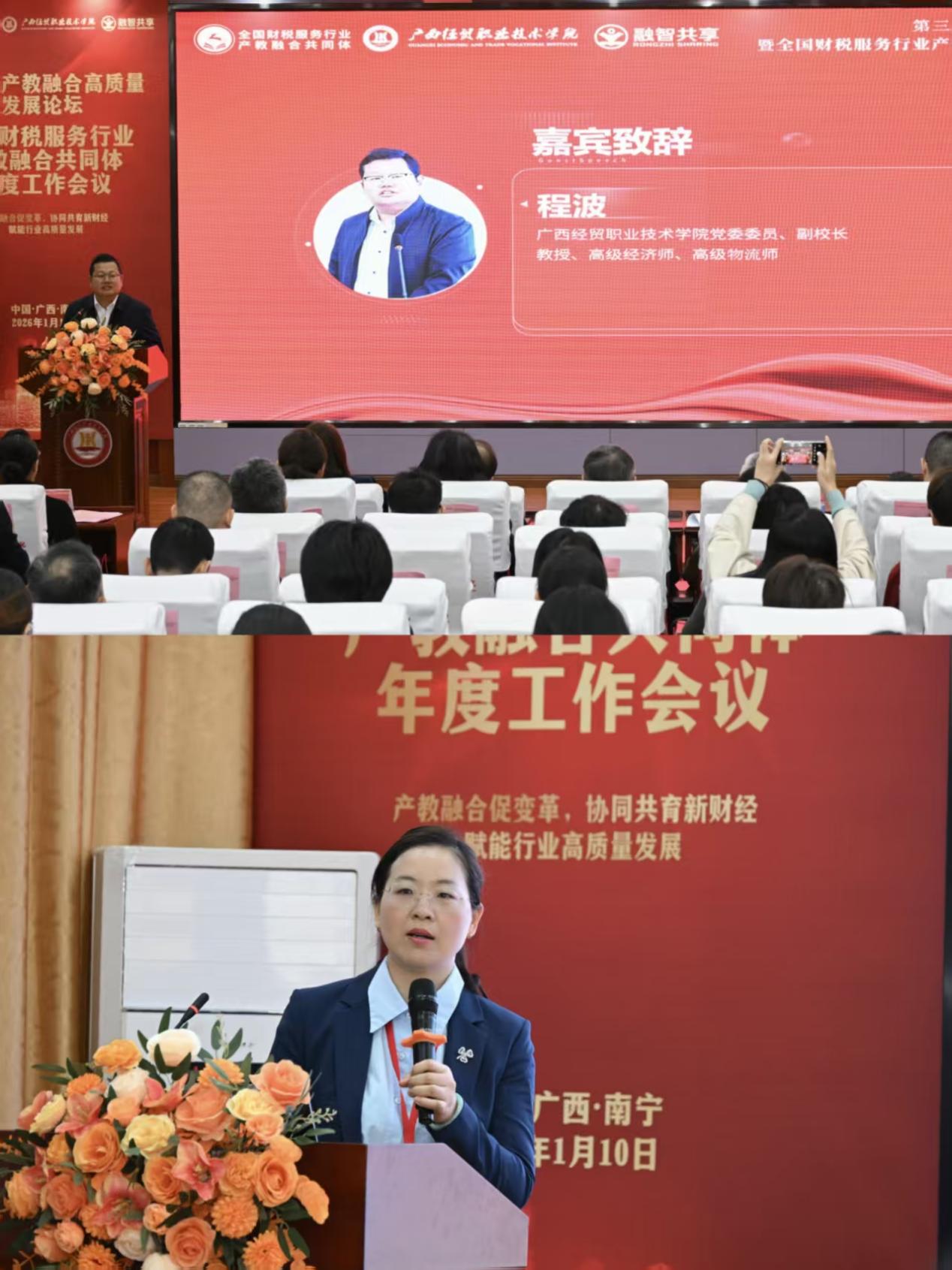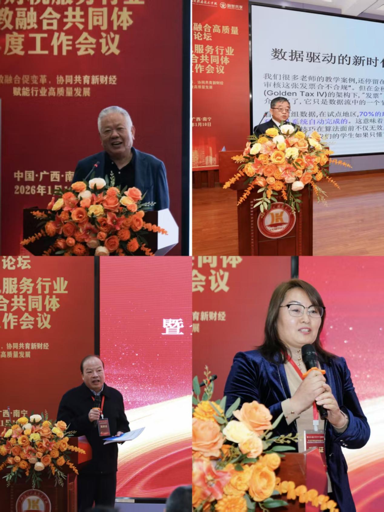 会议汇聚了财税服务行业与高等教育领域的众多专家学者。广西经贸职业技术学院党委委员、副校长程波教授出席并致辞,广州职业技术大学财经学院副院长吴娜教授代表共同体作年度工作报告。主题报告环节,中国财政科学研究院原副院长王朝才教授、暨南大学财税研究所所长杨森平教授、“万人计划”国家教学名师、广州职业技术大学财经学院原院长杨则文教授、正誉股份董事长鲁银花等人分别就经济形势、AI驱动发展、财富管理、产业转型等议题发表见解,为参会代表提供了高视角、前瞻性的行业洞察。