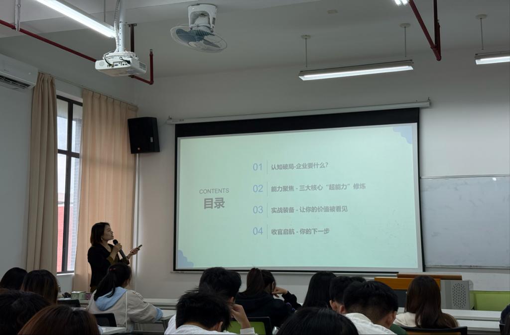 讲座以“游戏通关”为核心框架,分为“认知破局”“能力聚焦”“实战装备”“收官启航”四大模块,层层递进拆解职场成长路径。在“认知破局”环节,她结合“人才冰山模型”,深刻解读企业招聘的“战斗力评估系统”,指出专业知识、成绩等“水上部分”是入职的基础门槛,而沟通协作、解决问题、责任心等“水下部分”的隐性能力,才是决定职场发展高度的关键。“能力聚焦”模块中,张老师以情景模拟任务“团队紧急报告协作”为切入点,引导同学们分组讨论应对队友拖延的解决方案,进而提炼出沟通协作力、解决问题力、学习适应力三大核心“超能力”的修炼方法。在“实战装备”环节,张老师重点传授了STAR法则的应用技巧,教导同学们如何将校园经历转化为HR青睐的求职故事。