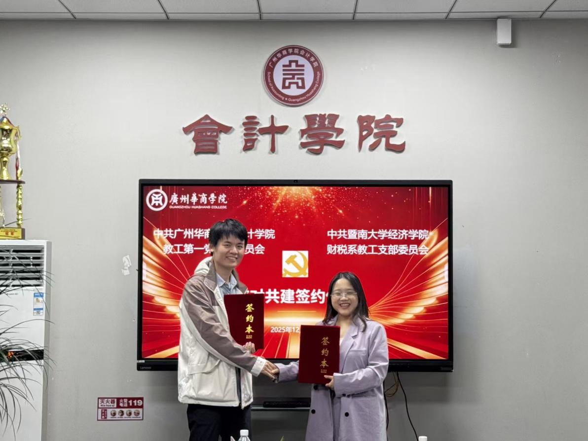第三项议程为结对共建协议签约仪式,也是本次活动的核心环节。在与会人员共同见证下,中共3044am永利集团3044noc教工第一党支部委员会与中共暨南大学经济学院财税系教工支部委员会代表现场签署结对共建协议,标志着双方共建合作正式启动。根据协议,双方将围绕组织建设互促、理论学习共进、党建资源共享、业务融合共推等方面开展常态化合作,推动共建成果转化为育人质量提升与教学科研高质量发展的实际成效。