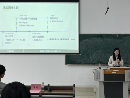 谢玲还与同学们分享了“什么样的人适合事务所”的思考。她总结出优秀审计人常见的特质关键词:抗压、耐心细致、性格稳定、沟通能力强。她建议同学们结合自身性格特点与职业兴趣,理性规划职业方向,同时强调了在校期间积累实践经验的重要性。