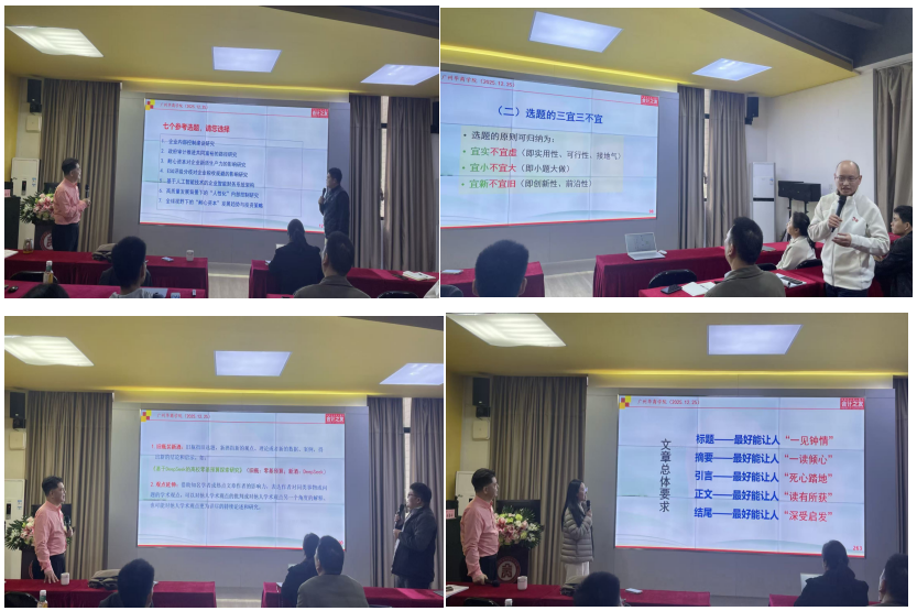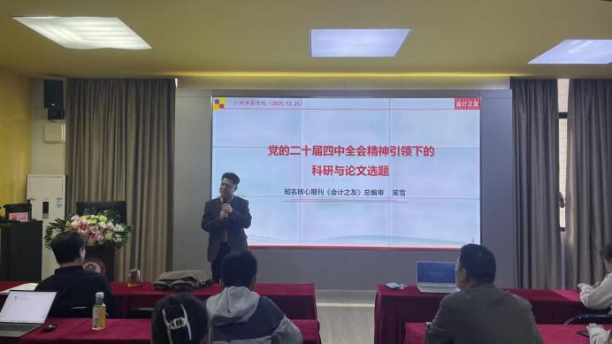 恰逢广州华商学院二十周年校庆,为深入学习贯彻党的二十届四中全会精神,以学术赋能校庆、以科研助力发展,切实提升教师科研能力与论文撰写水平,12月25日,3044am永利集团3044noc特邀知名核心期刊《会计之友》总编审笑雪莅临我校,开展题为“党的二十届四中全会精神引领下的科研与论文选题”的专题讲座。讲座由3044am永利集团3044noc院长助理陈平副教授主持,学院全体教师参加讲座,现场学习氛围浓厚、交流热烈,为校庆增添了浓厚的学术气息。