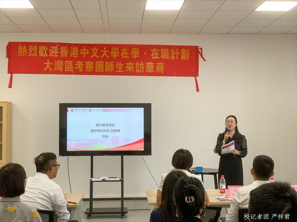 广州华商学院国际学院院长回雁雁为现场的香港中文大学师生分享了我校校区特色以及国际学院的发展前景。她表示学院的国际化教育要拥有面向全球的眼光,紧跟世界趋势,同时要立足于广东作为经济大省的地域优势,深挖当今国际交流的人才需求,培养拥有多元文化素养和专业技能的学生积极参与对外进行文化交流,传播好中国声音、讲好中国故事。她希望能够以此次座谈交流作为契机,不断促进双方友好交流,能够为我校国际化交流带来新的思考,相互合作寻找发展的机遇,助力培养与集聚粤港澳大湾区国际化创新型人才。