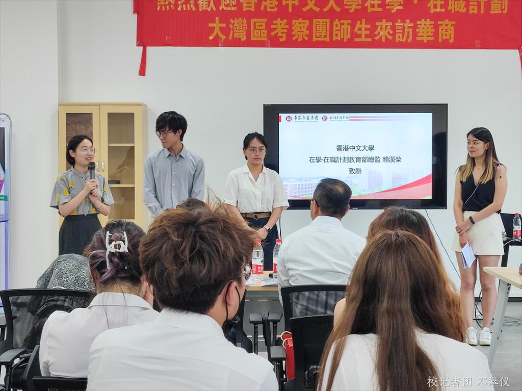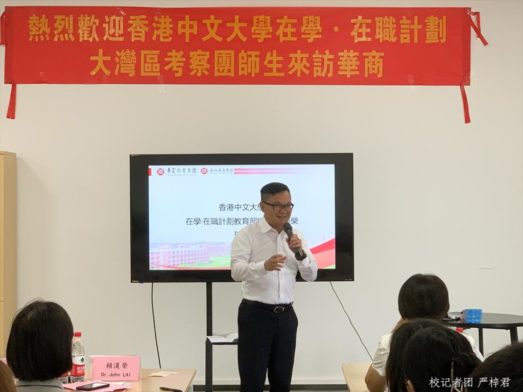 香港中文大学在学·在职计划教育部总监赖汉荣博士进行来宾致辞。他指出,面对粤港澳大湾区的融合,创新创业形势不容小觑,在学·在职计划是应时而生的良策。在介绍过程中,他请出四位来自港中文的学生代表讲解了关于港中文学院设计、书院制度以及在学·在职计划。学生代表介绍到,该项目鼓励学生在学习期间抽出时间到公司实习,以增强校企联合紧密度,提高自身就业竞争力。赖汉荣博士表示,华商学院地处粤港澳大湾区核心地带,钟灵毓秀,人杰地灵,学校对企业和创新极为重视,是全面推进发展粤港澳大湾区的潜在力量。