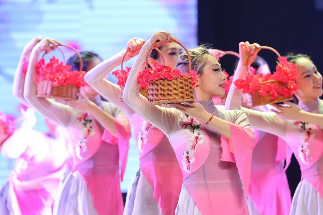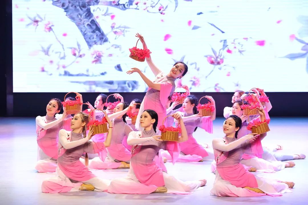 春风自有信,花开有香来。泉水叮咚,粉衣的舞者们手捧花篮,化身为一位位含苞待放的窈窕淑女。花般的女子们柔情似水,温情脉脉,嬉闹于花瓣飘舞的潺潺流水边。民族民间舞《春风花信来》注重创新和意境,融入多元文化和国际化舞蹈语汇,富有时代气息。