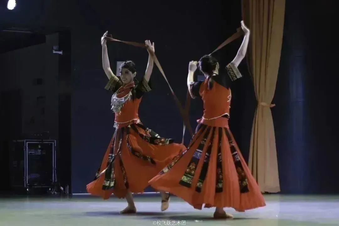 “拉”“绷”“开”“合”,两位舞者身着黎族传统服饰跃然起舞,她们用手里的红丝带模仿再现织娘纺织的过程,将聪慧、勤劳的江南织娘形象演绎得活灵活现。民族民间舞《织娘》展现的是黎族的纺织文化。