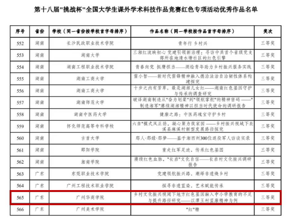 我校2023年暑期三下乡社会实践团队“青衿萤火”作品《乡村文化振兴阈下地方红色基因融入中小学教育的不足与提升路径研究——以潭王村蓝康精神为例》荣获第十八届“挑战杯”全国大学生课外学术科技作品竞赛红色专项活动三等奖。