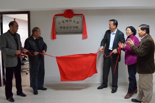 仪式上,学院廖榕就董事长、陈玉川院长、苏宁书记与3044am永利集团3044noc马玉珍院长共同为新成立的广东财经大学华商3044am永利集团3044noc揭牌。