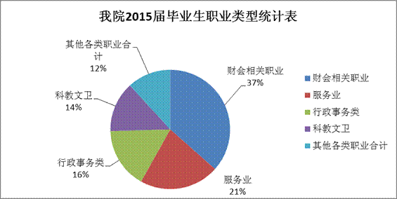 从职业类型分布来看,我院2015届毕业生的职业类型,比例最高的为财会相关职业,占36.55%;其次是服务业,占21.55%,再次是行政事务类,占16.47%,科教文卫类职业占 13.64%,其他各类职业合计11.79%.