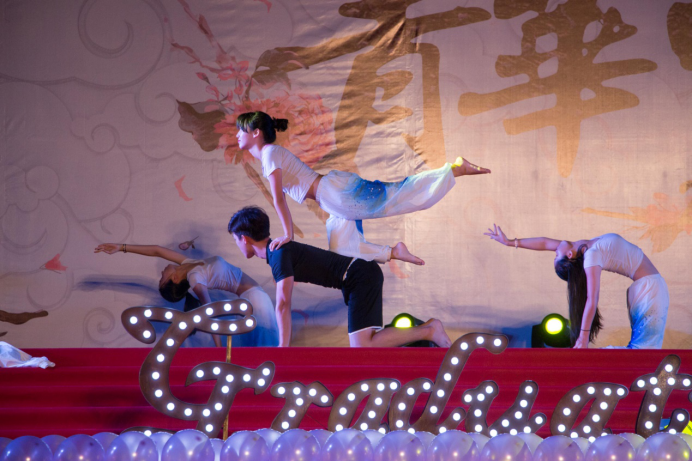 此次晚会分为三个篇章,第一篇章为“和光同尘”。作为此章的第一个节目,FM舞乐团带了舞蹈《青春进行曲》,她们充满活力的舞蹈唤起青春的回忆,激起观众们的热情。毕业生们出到社会后,忆起在华商度过的青春的日子,也会十分怀念吧。接下来,健身协会带来了舞蹈瑜伽《凉凉》,表演者柔软的身段,优美的身姿将这首歌的柔美表现地淋漓尽致。