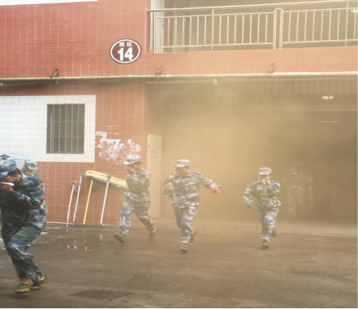 10月15日下午3点,随着一阵急促的警报声在学生宿舍西14栋响起, “消防知识进军训”正式开始。顿时,浓烟弥漫!参加演习的学生听到警报声后,在军训教官、辅导员、宿管员的指引下快速疏散。他们用湿毛巾捂住口鼻、弯着腰、弓着步沿着安全通道快速有序地撤离到宿舍楼下。