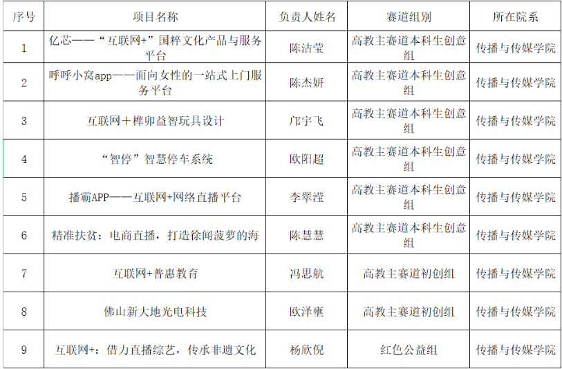 本网讯:传播与传媒学院9个参赛项目入围第七届“互联网+”大学生创新创业大赛华商学院选拔赛决赛。6月14日,广州华商学院创新创业学院公布入围第七届中国国际“互联网+”大学生创新创业大赛华商学院选拔赛决赛项目团队名单,我院共有9组参赛项目晋级校级决赛,位居全校第一,创我院参赛以来最好成绩,全校共有34组项目晋级决赛,决赛将于6月19日在线上举行。