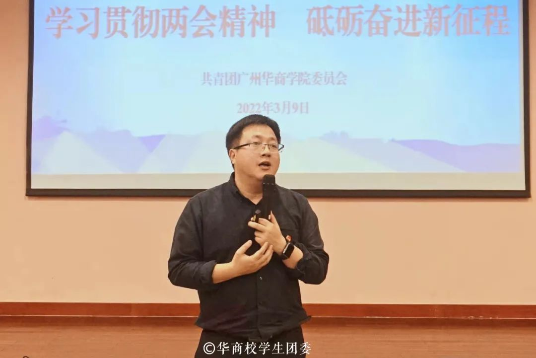 新时代的青年,青春正当时,奋斗正当时。为庆祝建团百年,激昂青春奋斗,聚焦“两会”精神,帮助学员们深刻领悟党和国家的发展战略、决策部署以及各项举措,深化学员们对于“两会”精神的学习,准确把握“两会”精神的实质和科学内涵,以实际行动迎接党的二十大胜利召开和建团100周年。广州华商学院第十期“青马班”授课于2022年3月9日18:00在国际会议中心报告厅举行。授课主讲人为校团委陈刚副书记。