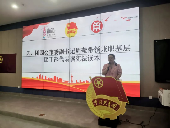 团四会市委副书记申振祥带领在场师生传达学习习近平总书记在庆祝中国共产主义青年团成立100周年大会上的重要讲话精神。副书记周莹带领在场学生代表宣读《中华人民共和国宪法》第四十六条:中华人民共和国公民有受教育的权利和义务。国家培养青年、少年、儿童在品德、智力、体质等方面全面发展。