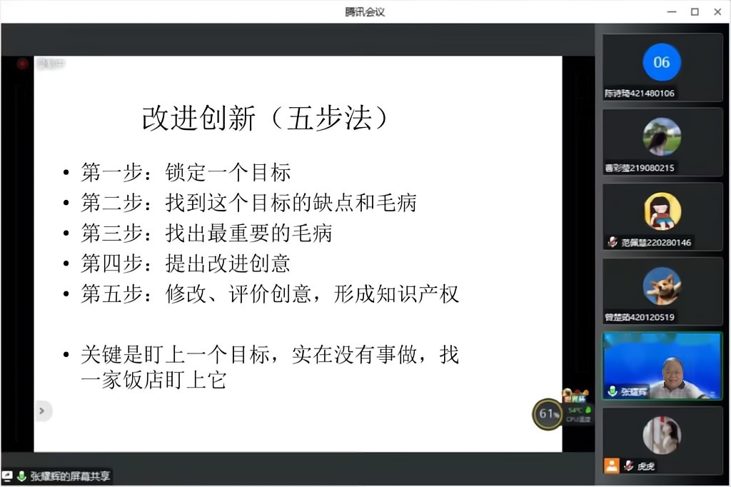 张耀辉教授为大家详细介绍创新方案的改进五步法,由锁定一个目标到提出创意修改,深度剖析了创新的本质,意在提高学生们的思辨能力。此外,张耀辉教授引导学生争做领头羊,掌握独立思考的方法,增强团队协作能力。同时教导同学们积极分享思考结果,促进团队合作,共同进步。