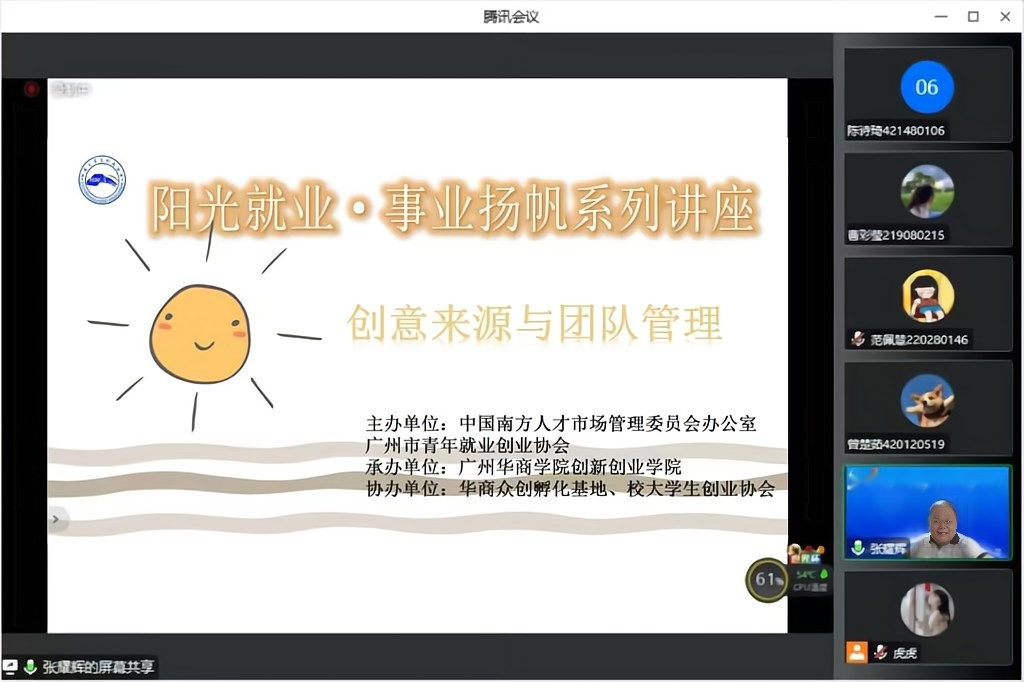 为增强学生团队意识,用发散性思维看待和分析问题,锻炼其创新能力,2022年11月22日由中国南方人才市场管理委员会办公室、广州市青年就业创业协会主办,广州华商学院创新创业学院承办,华商众创孵化基地、校大学生创业协会协办的“阳光就业,事业扬帆”就业创业指导进校园活动系列讲座《创意来源与团队管理》以线上的形式举行。