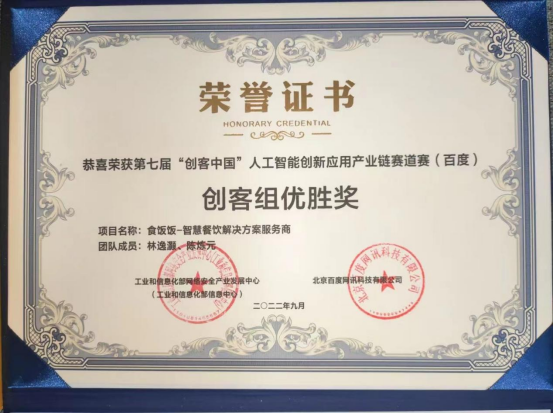 12月9日,由工业和信息化部信息中心、百度联合主办的第七届“创客中国”人工智能创新应用产业链赛道赛(百度)颁奖典礼在位于上海张江的百度飞桨人工智能产业赋能中心举行。广州华商学院2021届校友、广州小黑科技有限公司总经理林逸灏带领团队,以人工智能和物联网(loT)技术为核心基础,凭借《食饭饭--智慧餐饮解决方案服务商》项目荣获创客组优胜奖。