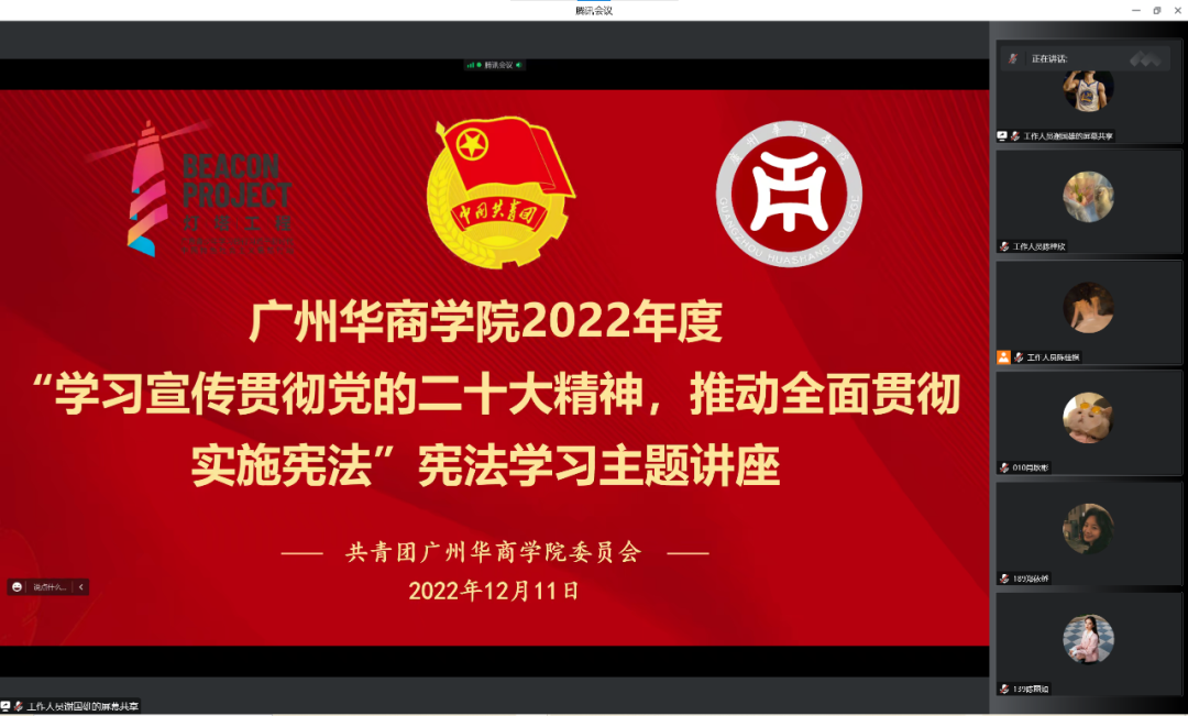 为深入学习宣传贯彻党的二十大精神,推动学习贯彻习近平法治思想,弘扬宪法精神,引导广大华商青年学习宪法、尊崇宪法、维护宪法,增强法治观念,12月11日18:00,由共青团广州华商学院委员会主办,校团委学生委员会、校团委大学生新媒体发展中心承办的“学习宣传贯彻党的二十大精神,推动全面贯彻实施宪法”宪法学习讲座顺利开展。本次讲座由广州大学—意大利帕多瓦大学联合培养博士吴金晨老师主讲。