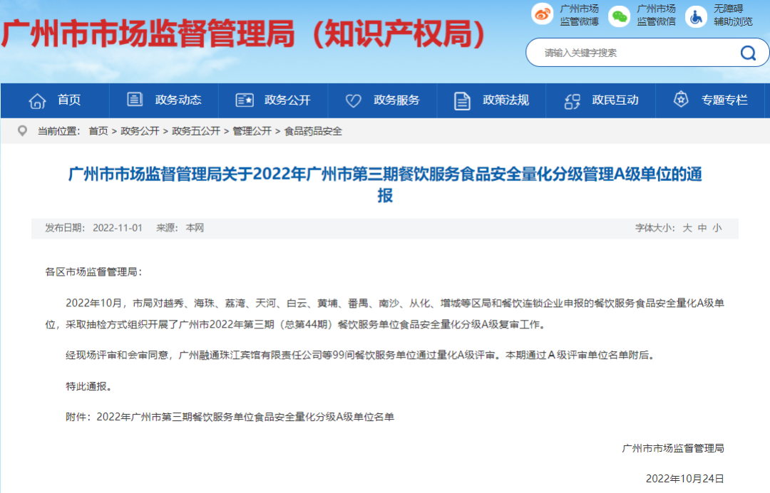 2022年10月,我校(增城校区)第一食堂在集团和学校全面监督管理下,经过装修升级,进一步规范布局流程、强化监督检查、提升服务质量,通过了省、市、区市场监督管理部门多次严格检查,获得广州市局授予 “食品安全量化A级”称号。