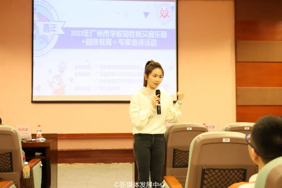 广东省性病艾滋病防治协会项目官员、广东省青少年性健康联盟技术指导顾问姚芷潞老师随后以现场互动问答&音乐剧场的方式展开课堂。问答互动环节中,阐述了性行为与性决定及艾滋病的相关知识;同时,利用“不尬青年”团队拍摄的知性防艾音乐剧《青春狂想曲》展开一系列话题互动。生动有趣的故事情节引发同学们强烈共鸣,动感舞蹈和音乐旋律抓人眼球。此外,姚老师还强调了大学生应该树立正确的恋爱观。现场师生聚精会神,积极参与互动,结合实际,深入思考,发现问题,踊跃发表自己的观点。现场气氛活跃,教学互动效果明显。