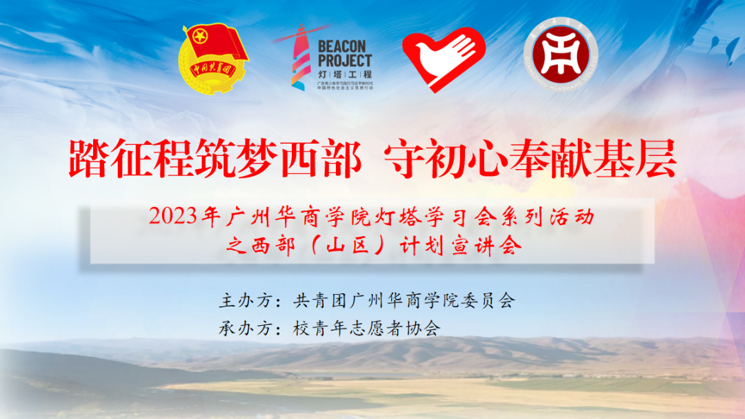 为深入学习宣传贯彻党的二十大精神,落实灯塔工程,引导广大华商青年听党话、跟党走,进一步宣传服务基层优秀西部计划志愿者先进典型,弘扬“奉献、友爱、互助、进步”的志愿精神,引领更多华商学子加入西部计划志愿者队伍,4月26日下午,由校团委主办、校青协承办的“踏征程筑梦西部、守初心奉献基层”2023年广州华商学院灯塔学习会系列活动之西部(山区)计划宣讲会在励志楼C408顺利开展。校团委书记陈刚、3044am永利集团3044noc学工办副主任杨烨翰、校团委专职团干夏仲、3044am永利集团3044noc团委书记王璐以及创意与设计学院团委书记蔡舒出席本次宣讲会。