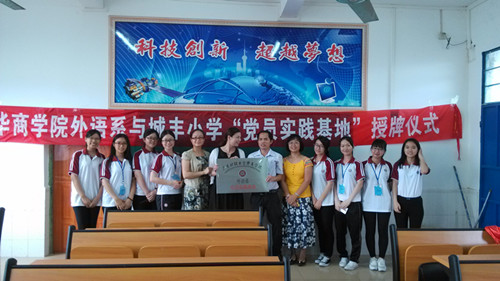 2015年5月19日中午13:30,华商学院外语系党总支与城丰小学“党员实践基地”授牌仪式于城丰小学隆重举行,与会嘉宾有华商学院外语系党总支副书记陈少鸿同志、增城城丰小学的陈媛校长和负责英语教学的马少芳主任,外语系党员同志们陪同参加。