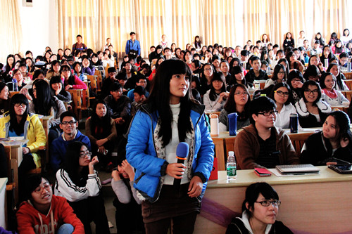 讲座还未开始,整个会场早已座无虚席,连过道都挤满了人。2点30分,讲座在同学们热忱的期盼中正式开始。首先,刘艳南老师简单的作了一个自我介绍,同学们以热烈的掌声欢迎她的到来。刘老师为同学们讲了什么是雅思和雅思在国外大学考试中的认可度,同学们因此对雅思有了一个大致的了解。在讲座中,刘老师详细地讲解了雅思的考试内容,其分为口语、阅读、听力和写作。她都一一为同学们介绍它们在雅思中分数所占比例和做题技巧,并带领同学们一起做了几道阅读题,列举几个常见的例子让同学们了解英语口音的知识。同学们都从这个讲座中了解到学习英语不仅仅限于语法和做题技巧,还需要学习西方的文化,从中发现各个地方的发音的不同之处。她还以自己的亲身经验告诉同学们背单词的有效方法,最重要的是持之以恒。最后,刘老师为同学们介绍了几个学习雅思英语的官方网站,希望同学们能够从网站中获得有效信息。愉快的时间总是过得飞快,刘老师轻松的语调让整个讲座处于活跃的气氛当中,在现场观众提问环节,同学们踊跃的参与其中,积极提问,刘老师都耐心地为他们解答。