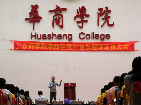 2010年10月26日下午2点30分,外语系在学院中央图书馆大厅召开了“广东商学院华商学院外语系迎评动员大会”。本次大会的主要目的是对外语系师生迎接2012年学士学位评估进行思想上的动员。大会由教学秘书郑坚坚主持,叶仕栋副主任、王秉金教授、刘学和研究员、外语系行政教辅人员、全体专职教师及全系学生出席了此次动员大会。