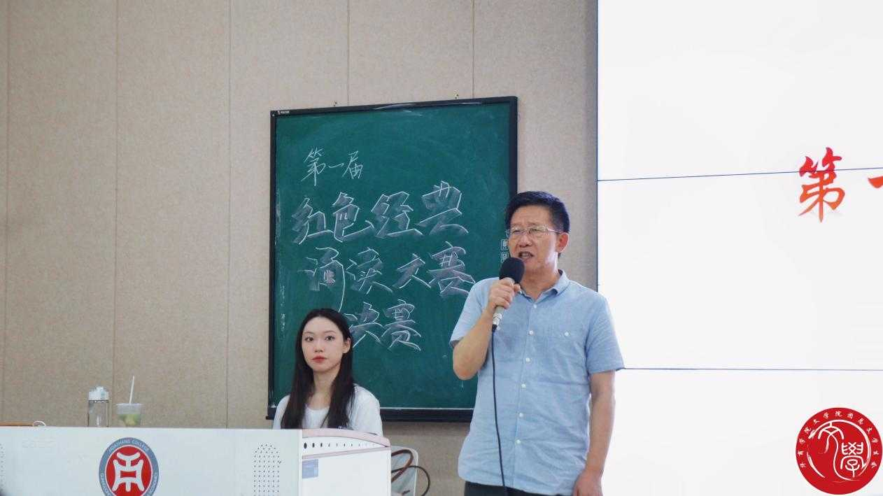 蒋家国副院长致开场辞。他表示,文学院的学生要培养两个最重要的基本功,这就是口头表达能力和书面表达能力。诵读、演讲、辩论等训练,是提高口头表达能力的有效途径。这次红色经典诵读活动,就是提高同学们口头表达能力的载体,是文学院开展第二课堂实训的重要举措。同时,这次活动也文学院课程思政由第一课堂向第二课堂的延伸,具有鲜明的政治意义。红色经典是我国民族文化的结晶,也是民族革命精神的象征。诵读红色经典,重温革命精神;亲近红色经典,树立使命担当。红色经典作品承载着历史叙述的重任,它以进步的历史观阐释过去、现在和未来。它包容了几代人的理想、青春和希望。因此,"红色经典"有着其它文学作品所无法替代的历史价值,很值得我们去诵读、领会和传承。希望通过这次红色经典诵读活动,同学们在专业学习上更加注重基本功的养成,在政治思想上要树立正确的世界观、人生观和价值观,争做党史知识的传播者和红色基因的传承者,用实际行动迎接党的二十大的胜利召开。