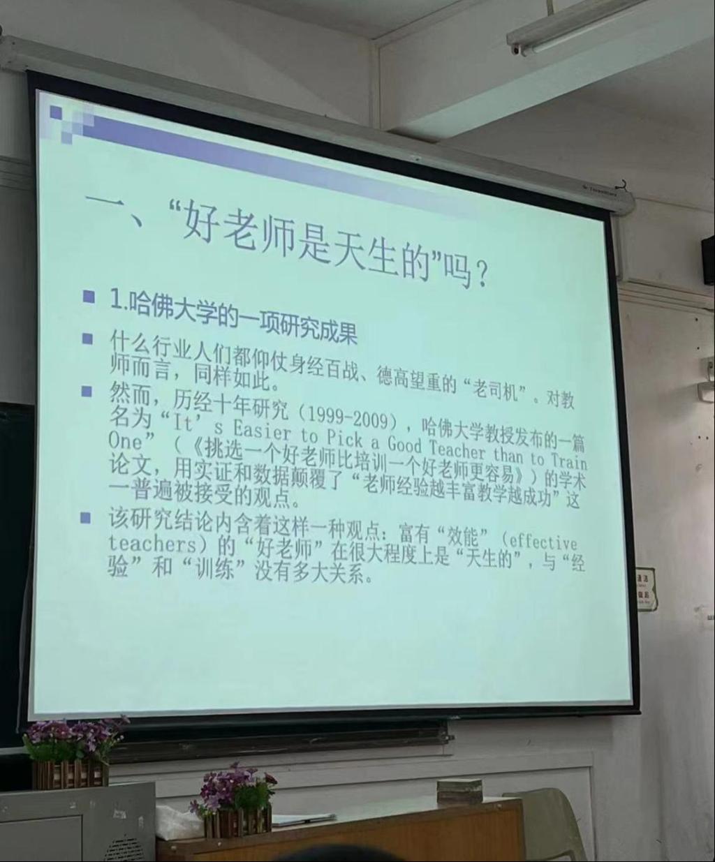 讲座伊始,扈中平教授以“好老师是天生的吗?”这一问题为切入点,围绕哈佛大学的一项研究成果提出观点:富有“效能”的“好老师”在很大程度上是“天生的”。针对以上成果,扈中平教授给出了:“教师经验”与“教师效能”具有一定的负相关性,这一结论依据。并通过对教师效能影响因素的进一步分析,肯定了以上观点。