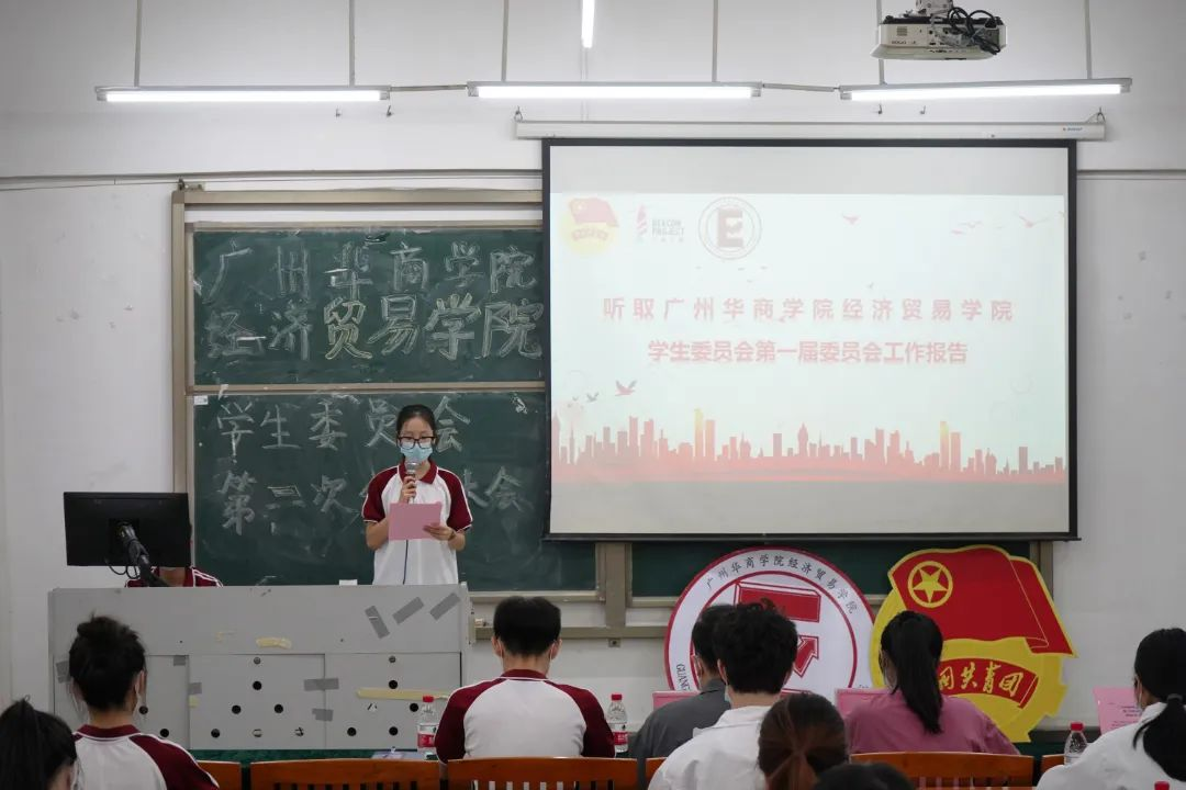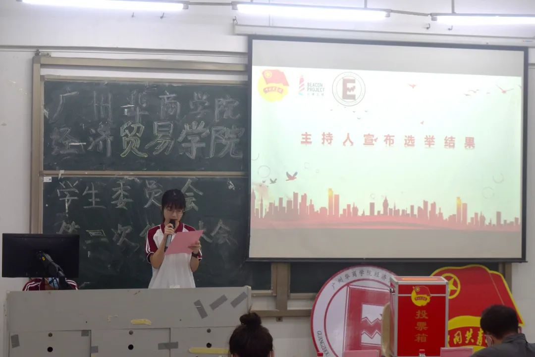 晚上七时四十分,由何绮琪同学主持会议。总监票人宋元跃老师宣读学生委员会的选举结果,主持人宣布广州华商学院经济贸易学院第二届学生委员会委员名单。