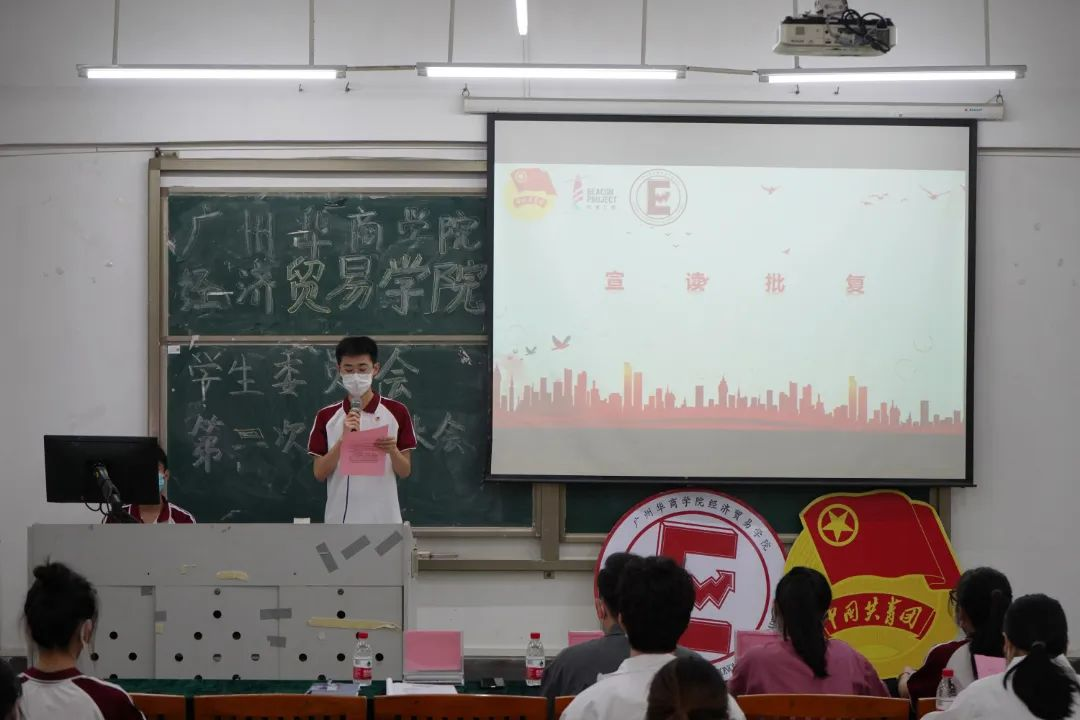 校学生委员会主席团成员韩弘涛宣读广州华商学院学生委员会《关于同意召开广州华商学院经济贸易学院第二次学生代表大会的批复》。