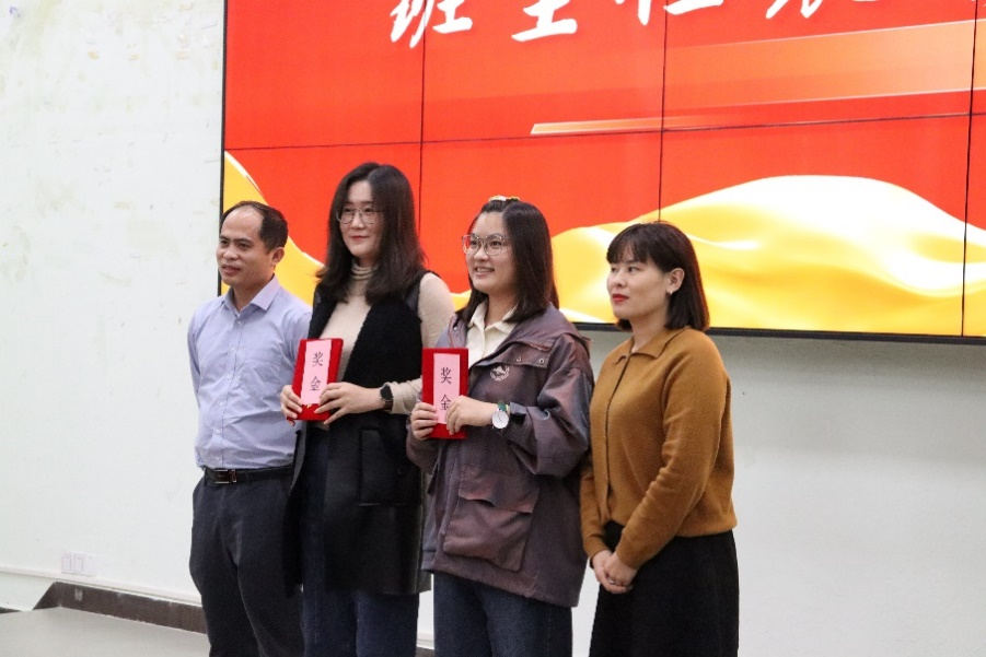 接着副院长谭建生宣读《广州华商学院关于表彰第一届优秀班主任决定》《教师教育学院关于表彰第一届优秀班主任的决定》。决定对获得“广州华商学院第一届优秀班主任”称号获得者杨慧、袁小婷给予表彰及奖励,由学工部部长许娜、人文学部副主任陈少鸿为两位班主任颁发了荣誉证书和奖金。谭建生院长希望受到表彰的老师,以此为新的起点,再接再厉,再立新功。同时鼓励全体老师以他们为榜样,不忘立德树人初心,牢记为党育人、为国育才的使命,全员全程全方位育人。