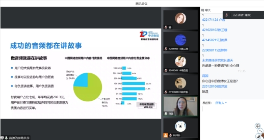 11月7日,传播与传媒学院网络与新媒体系邀请中清数据(广州)科技有限公司蒲源总经理,为大家开展主题为《音频会成为下一个社交宠儿吗? —— 5G时代音频布局与营销革命》的讲座。华商学院特聘教授、未来媒体研究院院长谭天教授,传播与传媒学院倪列怀副院长出席了本次讲座。因为疫情防控原因,本次讲座为线上形式,讲座总参与人数达到腾讯会议上限300人。