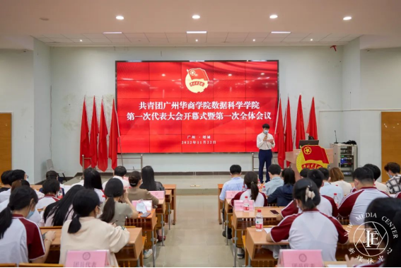 共青团广州华商学院数据科学学院第一次代表大会开幕式暨第一次全体会议于2022年11月22日12:20在励志楼C408召开,出席开幕式的有:学校党委宣传部部长刘苗,校团委书记陈刚,数据科学学院党委副书记、学院副院蒋大锐,校团委常委、经济贸易学院党委副书记宋元跃,校团委常委、国际学院团总支书记杨李军,校团委杨图珍,校团委夏仲,各二级学院团总支书记、副书记及数据科学学院辅导员以及团员代表。本次会议由数据科学学院团总支书记谢嘉希同志主持。