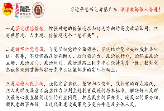 习近平总书记来到广东视察,为广东更加深入开展学习贯彻习近平新时代中国特色社会主义思想主题教育,以新担当新作为努力书写中国式现代化的广东新篇章,指明了方向。老师们指出,作有理想、有担当的新时代青年,要自觉将个人的成长成才与社会发展和时代主题紧密结合,要牢记习近平总书记嘱托,深刻认识广东在中国式现代化建设的大局中地位重要、作用突出,抓住机遇,打牢专业基础,培养国际化金融视野,积极参与社会实践,为推动粤港澳大湾区经济建设,为推进中国式现代化建设贡献青年力量。