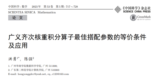近日,数据科学学院教师洪勇的论文“广义齐次核重积分算子最佳搭配参数的等价条件及应用”在我校认定的A1类《中国科学:数学》期刊上发表。