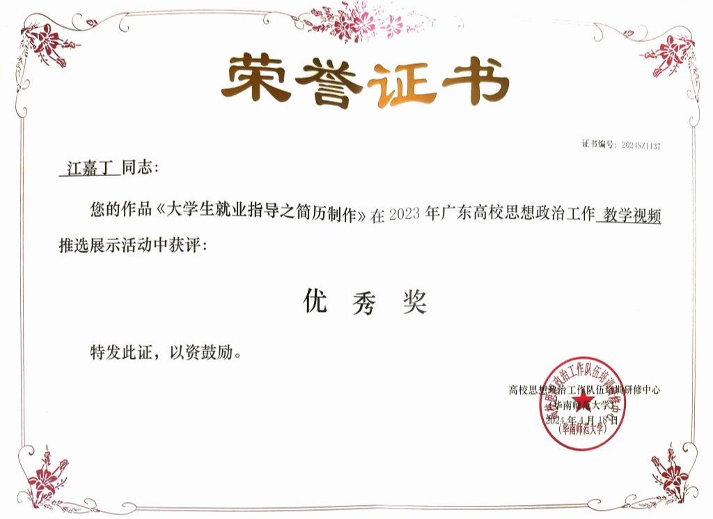 江嘉丁 | 《大学生就业指导之简历制作》 | 优秀奖 |