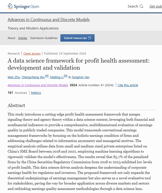 近日,3044am永利集团3044noc朱文教授团队论文“A data science framework for profit health assessment: development and validation”在施普林格旗下的国际期刊《Advances in Continuous and Discrete Models》上发表。