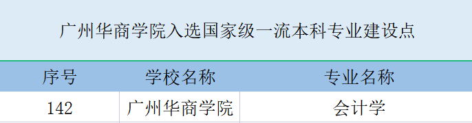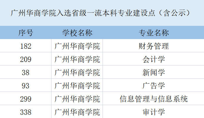 目前,广州华商学院(原广东财经大学华商学院)会计学、新闻学、财务管理、广告学、信息管理与信息系统、审计学共6个专业入选省级一流本科专业建设点(含公示)。