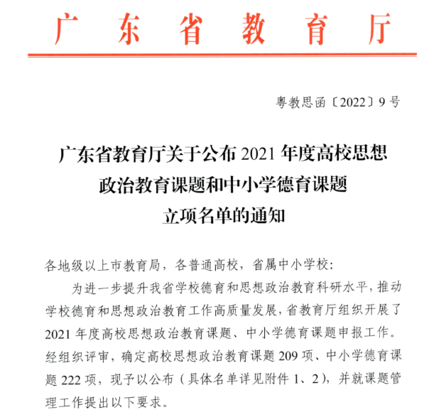 2022年5月12日,广东省教育科学规划领导小组办公室公布了2022年度省教育科学规划课题(党建研究专项)立项名单,我校学生处许娜处长申报的《新形势下高校学生党员教育培训质量提升路径研究》(项目编号:2022JKDJ100)项目获批立项。