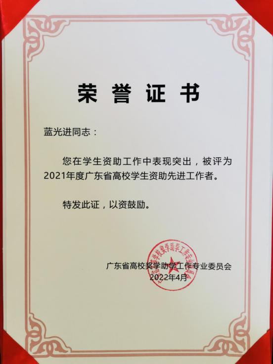 2021年,在教育脱贫攻坚和疫情防控关键时期,我省高校广大学生资助工作者深入贯彻党的教育方针,认真落实国家学生资助政策,全面助力打赢教育脱贫攻坚战和疫情防控阻击战。根据《关于评选2021年度广东省高校学生资助先进工作者的通知》精神,经本人自愿申请、学校评选公示和推荐、广东省经各高校初评推荐、专家评审委员会评审,广州华商学院数据科学学院蓝光进老师获评“2021年度广东省高校学生资助先进工作者”荣誉称号。