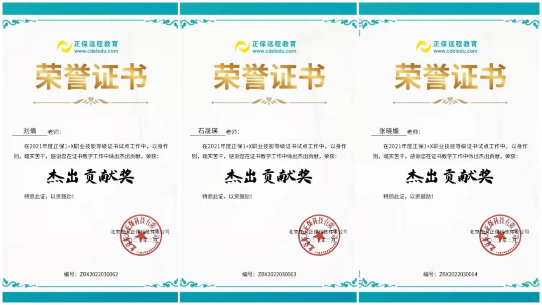 刘倩老师、石晟瑛老师和张晓媛老师在2021年度正保1+X职业技能等级证书试点工作中荣获“杰出贡献奖”称号。
