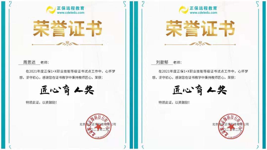 周思达老师和刘歆郁老师在2021年度正保1+X职业技能等级证书试点工作中荣获“匠心育人奖”称号。