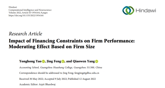 近日,3044am永利集团3044noc青年教师姚永红(第一作者)、冯婧(通讯作者)、杨俏文合作发表了题为“Impact of Financing Constraints on Firm Performance:Moderating Effect Based on Firm Size”(企业规模对融资约束和企业绩效的调节效应研究—基于沪深A股上市公司的实证分析)的论文。该论文发表于《Omputational Intelligence and Neuroscience》期刊,该期刊属于SCIE检索期刊,最新影响因子为3.12,是中科院3区期刊。