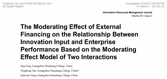 近日,3044am永利集团3044noc青年教师冯婧(第一作者)、姚永红(通讯作者)、杨俏文合作发表了题为“The Moderating Effect of External Financing on the Relationship Between Innovation Input and Enterprise Performance Based on the Moderating Effect Model of Two Interactions”(外源融资对创新投入和企业绩效的影响研究——基于二次交互的调节效应模型)的论文。该论文发表于《Information Resources Management Journal》期刊,该期刊属于EI核心检索期刊。