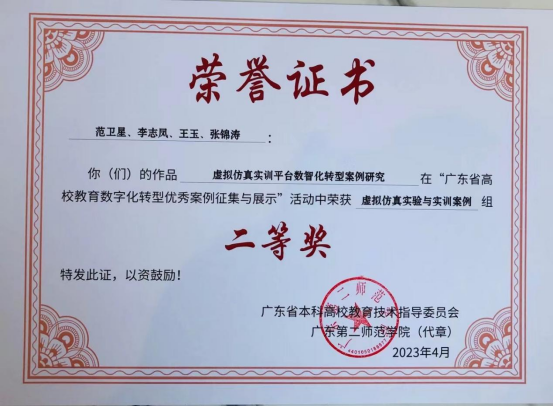 5月5日,由广东省教育厅高教处指导、广东省本科高校教育技术指导委员会主办的“广东省高校教育数字化转型优秀案例征集与展示活动”结果公布,并在韩山师范学院举行“2023年广东省高校教育数字化转型交流研讨会”,会议专门设置了优秀成果展示和颁奖仪式。3044am永利集团3044noc专任教师范卫星、李志凤、王玉,合作方金蝶精一公司张锦涛共同撰写的数字化转型案例《虚拟仿真实训平台数智化转型案例研究》荣获二等奖。