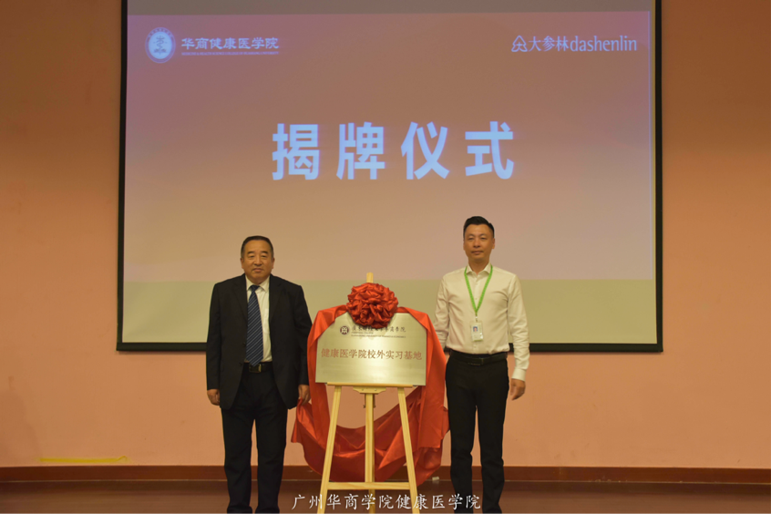 签署协议后,华商学院健康医学院王振月院长、大参林医药集团股份有限公司陶伟总监在现场为“健康医学院校外实践基地”揭牌。