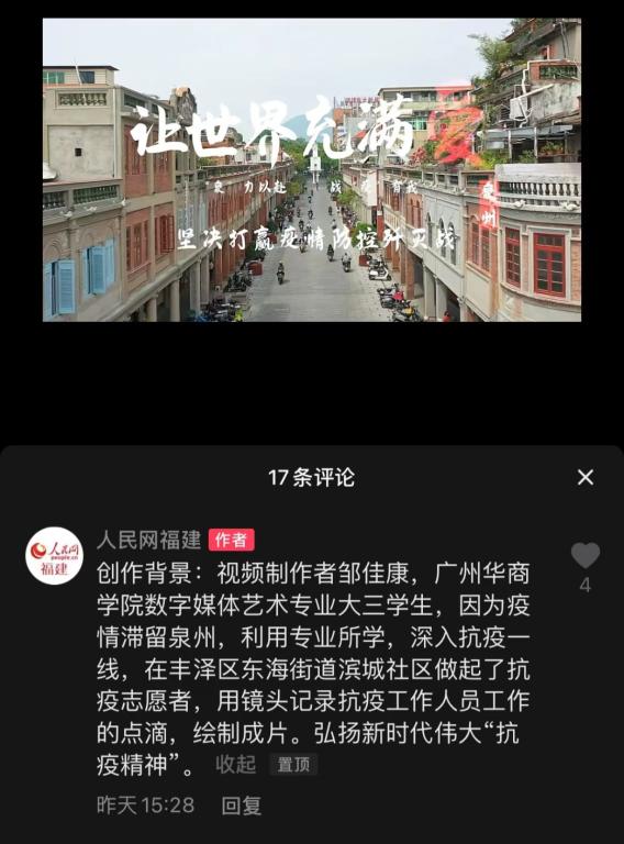 4月18日,我校创意与设计学院数字媒体艺术专业2019级学生邹佳康以泉州抗疫为原型摄制的MV《让世界充满爱》,被人民网和福州广播电视集团等主流媒体转载采用,获得众多网友点赞好评。